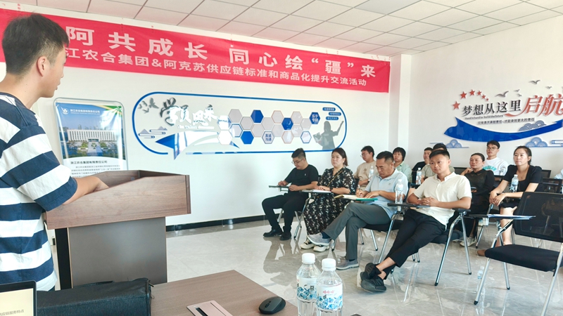 為更好打響“阿克蘇禮物”品牌,積極推動“疆品出疆”“疆果東送”行動,促進阿克蘇地區(qū)建立健全農(nóng)特產(chǎn)品產(chǎn)業(yè)鏈及供應鏈并高效運作,日前,在杭州市援疆指揮部的牽頭組織下,浙江農(nóng)合集團與阿克蘇市商務局在阿克蘇地區(qū)聯(lián)合舉辦“杭阿共成長·同心繪疆來”供應鏈標準及商品化能力提升系列交流活動,阿克蘇當?shù)?0余家企業(yè)代表出席。